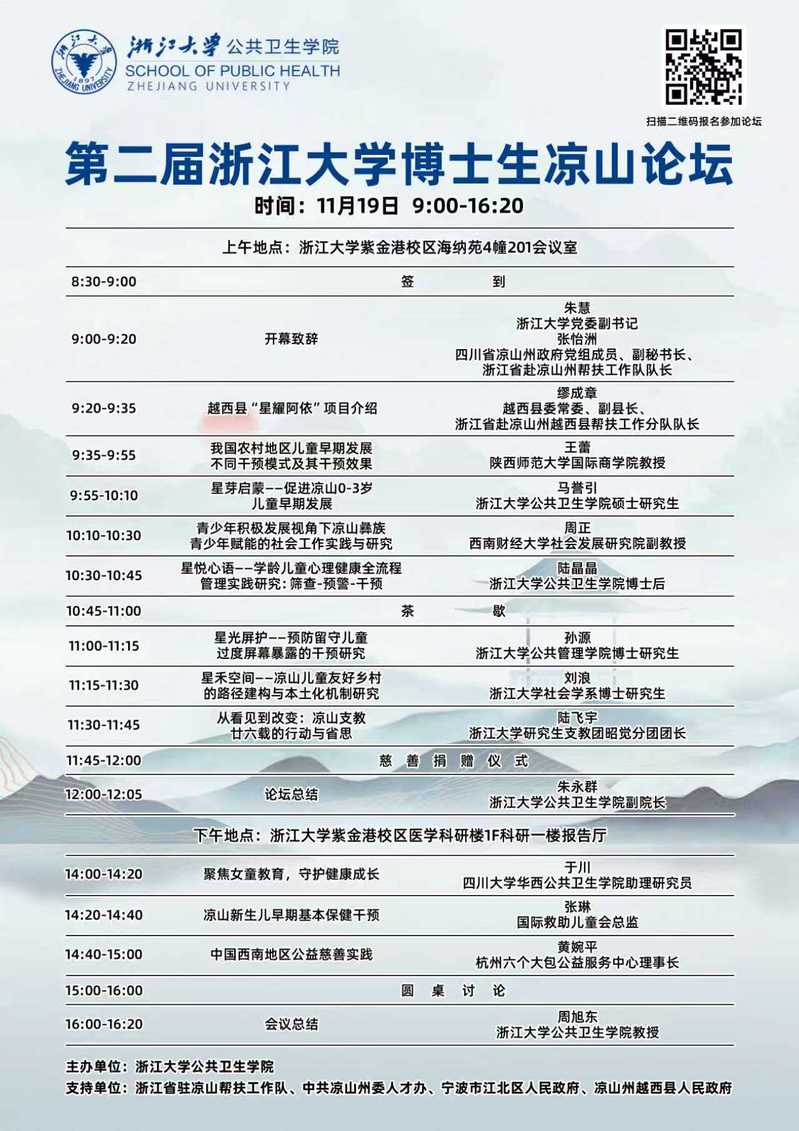 “浙江大学博士生凉山论坛”是浙江大学贯彻落实习近平总书记“把论文写在祖国大地上”指示精神的生动实践,也是浙江省驻凉山帮扶工作队探索组团式帮扶的重要平台。2024年11月,首届论坛在浙江大学成功举办。博士生们同与会嘉宾围绕凉山乡村振兴新路径展开多维度研讨,覆盖从问题甄别、全球循证解题,到社会筹资、扎根凉山实践,再到模式推广的全链条路径,为助力凉山振兴凝聚共识并明确前进方向。第二届浙江大学博士生凉山论坛将于11月19日在浙江大学紫金港校区启幕,续写华章。论坛由浙江大学公共卫生学院主办,内容聚焦儿童健康发展,融汇高校前沿科研与地方实践经验,构筑起青年人才服务国家战略、实践反哺育人的双向赋能桥梁,为凉山内生发展激发持续动能,为凉山全面振兴注入多元活力。欢迎校内外广大师生、科研人员以及关心凉山帮扶事业的实务工作者莅临参会,共谋发展。欢迎扫码报名参会!会议提供午饭,报名时间截至11月18日中午12点。
